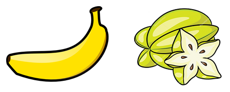 水果:蕉、榴槤、椰子、蕃石榴、龍眼、荔枝、杧果、楊桃、奇異果、士多啤梨